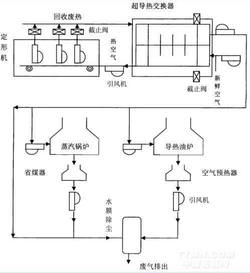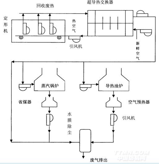 定形機(jī)廢熱→超導(dǎo)熱交換機(jī)→引風(fēng)機(jī)→導(dǎo)熱油爐、蒸汽鍋爐(熱空氣再供定形機(jī))→水膜除塵→廢氣廢熱鍋爐(油爐)煙囪排出。