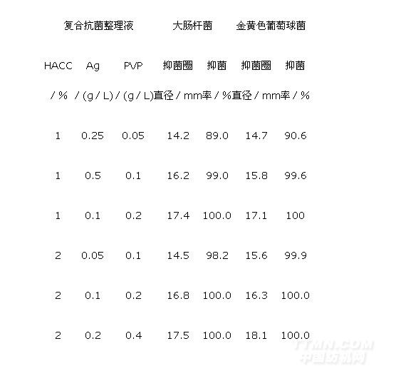 預(yù)先配制一定濃度的PVP(納米Ag的高分子分散劑)溶液,置于超聲波發(fā)生器內(nèi),機(jī)械攪拌下加入一定質(zhì)量的納米Ag及少許106黏合劑(自交聯(lián)丙烯酸酯型),加去離子水至100mL。超聲波分散30min后,得到納米Ag分散懸浮液。最后加入一定量HACC的水溶液,得到Ag/HACC復(fù)合抗菌整理液。