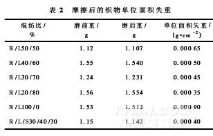 設(shè)定摩擦次數(shù)為50次,計算摩擦后的織物單位面積失重,如表2所示。