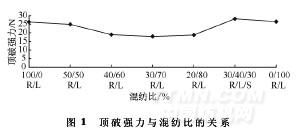 將第2組試樣固定在夾布圓環(huán)內(nèi),彈子按一定速度垂直頂向試樣,直至頂破,儀器自動顯示頂破強度。每種織物取6塊試樣,測出各試樣的頂破強力,然后取平均值。同時,在本次測試中加入同等規(guī)格的純拉伸細化羊毛(R/L,0/100)織物作為對比試樣,為不同混紡比的頂破強力試驗提供參照。結(jié)果如圖1所示。