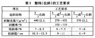 直線型緯斜的整緯(拉斜)工藝要求見表1(以下是針對常規(guī)的縮水整理的牛仔布)。