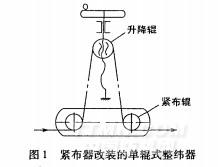 利用緊布器改裝的單輥式整緯器(圖1),也可以起擴(kuò)幅作用。其操作簡單,但只能對3。左右的緯斜進(jìn)行整緯,建議安裝在縮水機(jī)進(jìn)橡毯前。