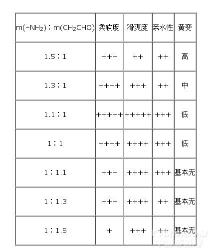 表2m(–NH2)︰m(CH2CHO)對新型超柔軟滑爽硅油性能的影響