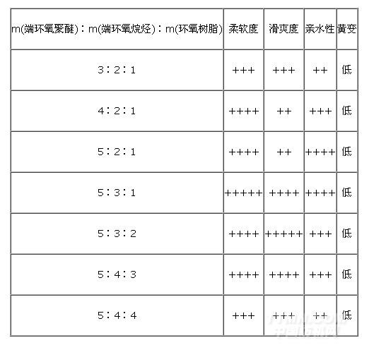 表3 m(端環(huán)氧聚醚)︰m(端環(huán)氧烷烴)︰m(環(huán)氧樹脂)對新型超柔軟滑爽硅油性能的影響