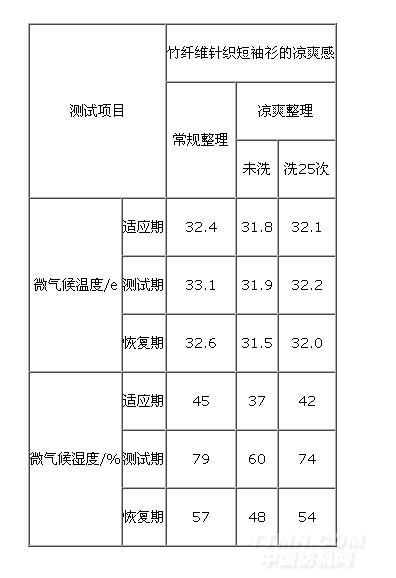 由表1可知,經(jīng)涼爽整理的竹纖維針織面料,其微氣候溫度較一般竹纖維針織面料低0.6~1.2e,微氣候濕度也顯著降低,水洗25次后仍有效。