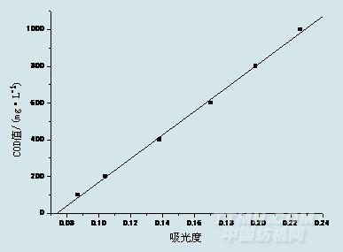 實(shí)驗(yàn)結(jié)果表明,隨著COD值增大,吸光度呈線(xiàn)性增大,如圖1。