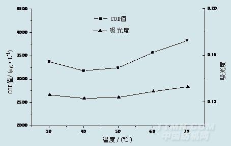 為了考察溫度對對殘液COD值的影響,分別在30℃(常溫)、40℃、50℃、60℃、70℃下實(shí)驗(yàn),結(jié)果如圖3。