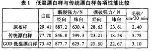 取未精練的退漿純棉機(jī)織布,采用上述優(yōu)化的葡萄糖氧化酶(GOD)低溫漂白工藝處方對(duì)其進(jìn)行漂白,測(cè)試試樣的各項(xiàng)性能,并與傳統(tǒng)漂白樣進(jìn)行比較,結(jié)果如表1所示。
