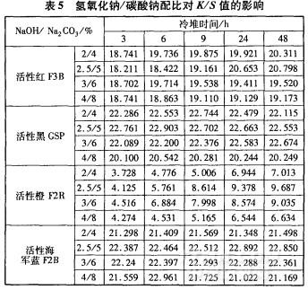 表5中,氫氧化鈉/碳酸鈉為2.5%/5%時,活性染料經(jīng)24h冷堆后固著率達到最高。堿劑配比對4只染料的固著率差異不大,說明氫氧化鈉/碳酸鈉對染料水解的影響相差不大。此外,冷堆9h,K/S值已較高,再延長時間,K/S值增加不明顯。