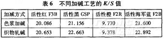 比較色漿直接加堿和織物軋堿兩種工藝,采用以上試驗最佳的堿劑配方(即色漿加堿工藝碳酸鈉2%,織物軋堿工藝氫氧化鈉2.5%/碳酸鈉5%)進行冷堆印花試驗,堆置時間24h,測定織物K/S值(表6)。