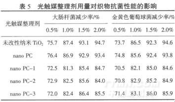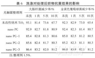 由表6可知,未改性納米Ti02處理的織物,洗滌后抗菌效果明顯下降,且洗滌次數(shù)越多,下降程度越大.而nano PC系列光觸媒整理劑處理織物時(shí),尤其是nano PC-1、nano PC-2和nano PC-3整理劑,盡管在相同整理劑用量情況下,處理后織物的抗菌效率稍低,但因交聯(lián)劑的存在,與纖維發(fā)生了共價(jià)鍵的接枝或交聯(lián)反應(yīng),提高了纖維與整理劑的結(jié)合牢度,使得處理后織物的耐洗性提高,洗滌10次后,其抗菌性能仍能保持原有的水平.