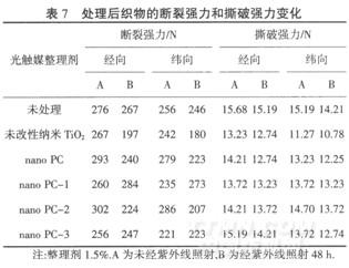 由表7可以看出,未經(jīng)紫外線(xiàn)照射的各類(lèi)納米整理劑處理后的織物,在短時(shí)間內(nèi)的斷裂強(qiáng)力和撕破強(qiáng)力與未經(jīng)整理的織物比較,部分稍有下降或提高,但變化不大.而不同納米光觸媒整理劑整理后的織物經(jīng)紫外線(xiàn)照射一段時(shí)間后,則出現(xiàn)很大的差異:未改性的納米Ti02處理后的織物,經(jīng)紫外線(xiàn)照射48 h后,其斷裂強(qiáng)力和撕破強(qiáng)力的下降幅度大于nano PC系列納米光觸媒整理劑處理后的織物;而用nano PC系列納米光觸媒整理劑處理后的織物,經(jīng)紫外線(xiàn)照射后,其斷裂強(qiáng)力和撕破強(qiáng)力的下降差值低于用未改性的納米Ti02處理的織物,原因是改性納米Ti02表面存在的硅氧鍵等基團(tuán),可以隔離納米Ti02與纖維的直接接觸,對(duì)纖維有一定的保護(hù)作用,利用本文開(kāi)發(fā)的系列改性納米Ti02光觸媒劑使Tioz對(duì)纖維的光氧化作用降低.可以擗龜或降低纖維的劣化覡象.