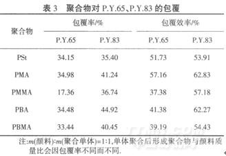 由表3可知,聚合物對P.Y.83的包覆率和包覆效率比P.Y.65高,原因是P.Y.83結(jié)構(gòu)中含有較多的苯環(huán)和酯基,與單體之間的疏水作用力較強,單體更易于吸附在顏料表面,并在引發(fā)劑下形成聚合物,實現(xiàn)對顏料的包覆.而P.Y.65結(jié)構(gòu)簡單,與單體之間的疏水作用力較小,單體不易于吸附在顏料表面,未吸附的單體會進入表面活性劑膠束,聚合形成聚合物微球,不能實現(xiàn)對顏料的包覆.