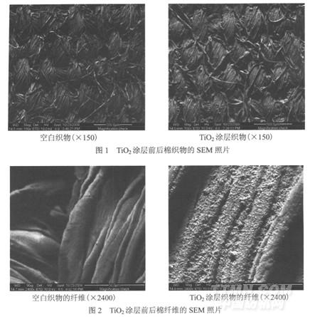 棉織物經Ti02涂層前后的SEM照片如圖l所示。由圖1可知,經Ti02涂層后,在織物表面形成了一層致密的PVDF-Ti02高分子膜,PVDF和Ti02填充了纖維交織點間空隙,使紗線結構變得較為緊密。