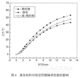 在制備隔熱涂層織物時,基布材料對其隔熱性能的影響是不容忽視的。纖維材料、組織規(guī)格、厚度等不同,所制得的涂層織物的隔熱性能也是千差萬別的。圖4為分別以棉織物、滌綸織物和滌/棉織物作為基布材料時,所制得的涂層織物的隔熱性能。