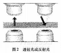 漸減弱。檢測系統(tǒng)分析各種信號變量,并通過計算機算出織物緯斜量。紅外線投光器照射到每個探測頭的光亮度均可以自動和單獨控制。對某些組織緊密的織物,光線很難穿透,可采用反射探測。每個探測頭均有個內(nèi)藏紅外線光源,可作為反射與穿透光源交替使用。圖2為探測頭的兩種工作狀態(tài)。