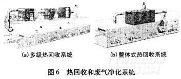 針織物坯布在預定形過程中,因編織加工中所帶油劑會在高溫下?lián)]發(fā),并隨廢氣排出。為減少油煙對環(huán)境的污染,可在廢氣的出口處設置除油煙裝置,將廢油與廢氣分離并加以回收再利用。德國布魯克納的定形機安裝了一套旋風式洗滌裝置,從烘房中排出的廢氣直接進入該裝置,以旋轉的水/空氣所形成的渦流產(chǎn)生細小的浪花而被清洗凈化。為防止氣流將水帶走,在定形機后面設置了一個水霧消除器。排出的廢氣經(jīng)冷卻后,溫度可降至65℃,并將所回收的熱量用于蒸發(fā)水分,而廢氣的臭味也可被吸收。污液沉淀在旋風洗滌裝置底部的污液儲存槽內,達到預定濃度時再傳送到薄膜式蒸發(fā)器中??蓺饣镏匦逻M入旋風洗滌裝置,而殘渣作為固體污染物被排放。該機有多級熱回收和整體式熱回收兩套系統(tǒng)(見圖6)可供選用。多級熱回收系統(tǒng)采用模塊化結構設計,可逐級擴展,熱能轉換好,生產(chǎn)效率高,節(jié)能最高可達35%(取決于具體工藝)。整體式熱回收系統(tǒng)也采用模塊化設計,清潔方便,操作簡便。采用鋁制翅片熱交換器,并有防黏涂層,可不停機進行清潔。熱回收裝置與烘房連為整體,省去額外安裝空間,可為大多數(shù)主機配置。