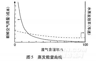 在設定的烘干時間內,烘房內水分蒸發(fā)量與織物材料、克重、幅寬、烘干能力以及烘干前后的織物含水率有關。圖5給出了新鮮空氣用量、水蒸發(fā)效率與加工成本的關系。蒸發(fā)能量曲線A較為平緩,而新鮮空氣消耗量(與成本有關)曲線B則較為陡峭。當廢氣排放閥門始終全開時,所排出廢氣中的水蒸氣含量非常少,這意味著烘干效率很低。因此,為了提高烘干效率,減少能耗,必須在保證生產(chǎn)效率的同時,盡可能提高排放廢氣中水蒸氣含量。