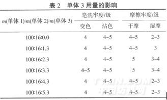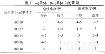 其它條件不變時(shí),改變單體配比,所合成的固色劑固色效果如表1所示.