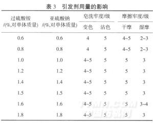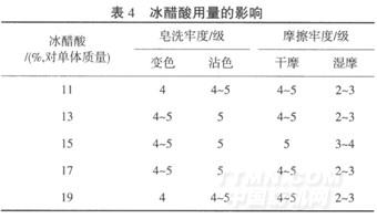 從表4可知,當(dāng)冰醋酸用量為15010時(shí),固色后的各項(xiàng)牢度較好,原因是反應(yīng)體系pH值過高或過低,對(duì)初級(jí)自由基的活性有一定影響,[10]冰醋酸用量以15%為宜.