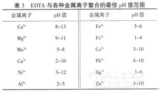 螯合劑與金屬離子形成螯合物,在不同的pH值情況下,其絡(luò)合穩(wěn)定常數(shù)是不同的.所以,選用螯合劑最重要的因素是要考慮溶液的pH值,同一個螯合劑在不同pH值時其螯合性能完全不同.例如EDTA在pH<3時幾乎不能將Ca2+、Mg2+螯合,而對Fe3+、Cu2+,即使pH值為1時,仍能定量地進(jìn)行螯合反應(yīng).而pH>12時,EDTA失去絡(luò)合能力(Ca2+除外).表3為各種金屬離子被EDTA螯合的最佳pH值范圍.Ca2+、Mg2+在堿性條件下進(jìn)行螯合,F(xiàn)e3+在酸性條件下進(jìn)行螯合,Cu2+較廣的pH值范圍內(nèi)螯合,每一個螯合劑對金屬離子螯合都有最適宜的pH值范圍.