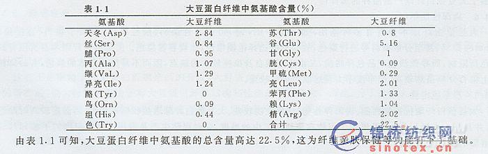 大豆蛋白纖維屬天然再生蛋白質纖維,纖維中含有多種人體所必需的氨基酸,其所含的各類氨基酸的量如表1.1所示.