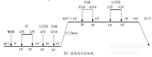 (1)煮枧 竹纖維染色后,要經(jīng)過煮枧來去掉布面上的浮色,然后經(jīng)80 ℃的熱水煮10 min,以調(diào)節(jié)布面的pH值。
