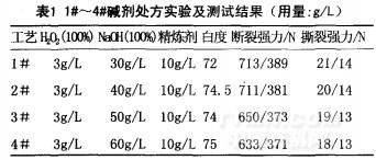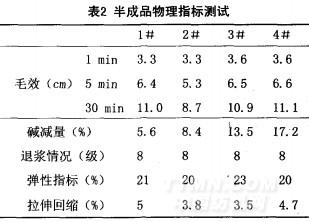 通過分析表1可知:1#~4#工藝處理的半成品白度基本差不多,強(qiáng)力損失程度1#工藝最小,斷裂強(qiáng)力、撕裂強(qiáng)力都比較高,效果最佳,4#工藝燒堿用量增多,但整體指標(biāo)合格。