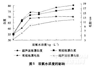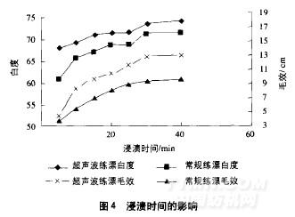 按上述優(yōu)化選擇的超聲波退漿工藝(酶29/L溫度60℃.時間5min)和常規(guī)退漿工藝(酶4glL.溫度60℃時間30min)對棉織物進行退漿處理然后在60℃下浸潰4g/L30%雙氧水然后在95一l00℃時汽蒸30min,圖4是不同浸潰時間下織物的毛效和白度。