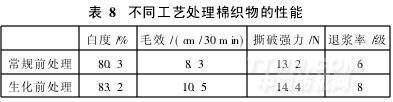 從表8可以看出,與常規(guī)工藝相比,采用連續(xù)式生化前處理工藝,織物的各項(xiàng)指標(biāo)均有提高,毛效提高25%以上,撕破強(qiáng)力提高9%,退漿率提高2級(jí)。