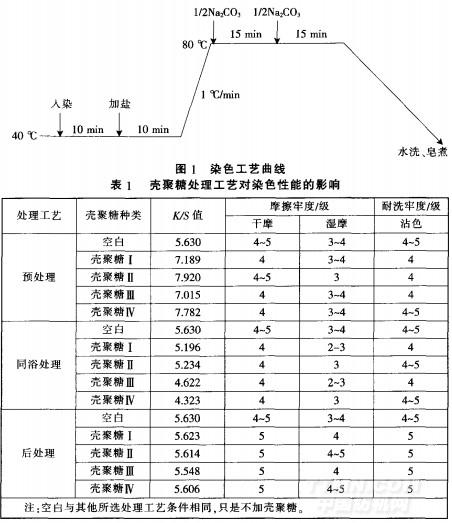 染色后經(jīng)殼聚糖處理的織物比未經(jīng)殼聚糖處理的織物的值略有下降.而摩擦牢度和耐洗牢度均提高0.5~1級這是因?yàn)闅ぞ厶强膳c棉纖維以范德華力、氫鍵結(jié)合.而且所帶陽離子也可與活性染料陰離子形成色淀沉積在棉纖維內(nèi)外.再加上殼聚糖會在織物表面形成一層保護(hù)膜.所以經(jīng)殼聚糖處理后的染色織物的摩擦牢度、耐洗牢度有所提高。