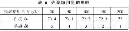 由表6知,殼聚糖對織物白度的影響不大,當(dāng)其用量達(dá)到100g/L時,織物手感變差。由于本研究中納米銀為主抗菌劑,殼聚糖主要起保護(hù)和抑制變色作用,因此為防止織物手感變差,選擇殼聚糖用量為20g/L。