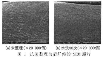 由圖1可以看出,未整理棉纖維(a)表面較為粗糙,存在明顯的溝槽和裂隙,有利于納米銀的滲透;經(jīng)抗菌整理后棉纖維(b),表面均勻覆蓋了一層殼聚糖膜,水洗50次后仍可保持完整。