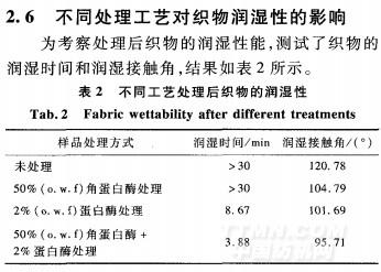 由表2可知,未處理的羊毛織物潤濕性很差。單獨(dú)使用角蛋白酶處理的織物,潤濕性稍有提高。因?yàn)榻堑鞍酌鸽m然能使羊毛鱗片的二硫交聯(lián)鍵打開,鱗片層中部分一S—S一還可能被還原成親水性的mSH或-sso~-’,但鱗片中的拒水性類脂層沒有被破壞,因此潤濕性改善較少。角蛋白酶+蛋白酶一浴法處理后,織物潤濕時(shí)間降低至3.88min,潤濕接觸角為95.71。潤濕性明顯改善。分析其原因可能為:角蛋白酶對二硫鍵的斷裂作用能使鱗片外層的可及度增大,纖維的親水性增強(qiáng),蛋白酶更易攻擊鱗片內(nèi)層,滲入纖維內(nèi)部,水解皮質(zhì)層和CMC;在蛋白酶的水解作用下鱗片表層的拒水性類脂物隨鱗片蛋白的水解而剝離,因此潤濕性提高。
