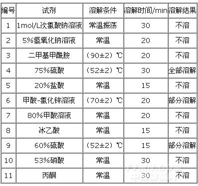木棉纖維具有良好的化學(xué)性能,耐酸性好,常溫下稀酸對其沒有影響,并且木棉纖維耐堿性能良好,常溫下NaOH對木棉沒有影響[4]。將木棉纖維置于不同的溶劑中,在不同的溶解條件下觀察其化學(xué)溶解情況,結(jié)果見表2。