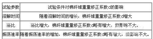同理,我們在條件變差(試驗溫度、試驗時間、浴比、振蕩速率)只有一個,而其它條件均不變的情況下,對莫代爾/棉纖維混紡產(chǎn)品進(jìn)行含量分析試驗,獲得到了不溶物——棉纖維的重量修正系數(shù)d。確定的試驗參數(shù)和試驗條件對棉纖維重量修正系數(shù)的影響如表1所示。