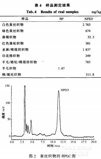 采用本文確定的實(shí)驗(yàn)方法對(duì)出口歐盟的紡織品樣品進(jìn)行了測(cè)試,測(cè)試結(jié)果見(jiàn)表4。從表4可以看出,出口紡織品中主要使用NPEO,大部分樣品中均可檢出濃度不等的NPEO,僅有1個(gè)樣品中檢出NP,而OP和OPEO則均未檢出。圖2為蠶絲織物甲醇萃取溶液的HPLC圖,可以看出,該樣品中殘留有NPEO.