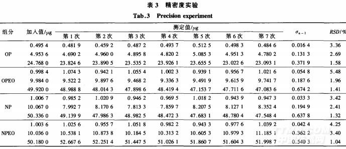 采用添加法在待測(cè)樣品中添加3個(gè)不同質(zhì)量濃度水平的OP,OPEO,NP和NPEO,進(jìn)行回收率測(cè)定。每個(gè)水平單獨(dú)測(cè)定9次。結(jié)果表明,其回收率為96.82%~103.39%。