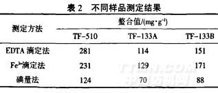綜合考慮,F(xiàn)e3+滴定法(用磺基水楊酸顯色)相對(duì)標(biāo)準(zhǔn)偏差最小,操作簡單、方便且不受放置時(shí)間、樣品本身顏色的影響,故測(cè)定螯合劑螫合能力時(shí)選擇此法為宜.EDTA滴定法測(cè)定TF-510螯合鐵能力時(shí),由于TF-510螯合能力相對(duì)較強(qiáng),在與Fe3+作用的過程中體系顏色(黃色)逐漸加深,從而影響滴定終點(diǎn)(亮黃色)的判定.其次,此法受樣品顏色的影響,故結(jié)果相對(duì)偏高.