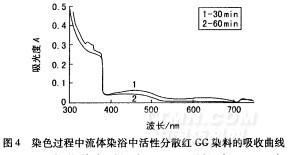圖4表明,染色時間由30min延長到60min時,流體染浴中染料的特征吸收峰明顯降低,表明當溶解染料進人染色釜并與真絲纖維接觸時,染料在纖維上發(fā)生吸附上染,從而使流體中溶解染料濃度降低。此外,流體染色時盡管采用了1:1000的大浴比,但在60min的染色時間內(nèi)也可使流體染浴中染料濃度明顯降低;而傳統(tǒng)水浴染色時,通常染浴中染料濃度的變化較小。這也表明超臨界CO2流體染色有助于提高染浴中染料向纖維表面的轉(zhuǎn)移或吸附上染,從而可有效提高活性分散紅GG染料在真絲纖維上的上染百分率。