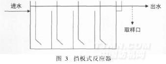 (3)擋板式水解酸化池 又稱折流式厭氧反應(yīng)器(Anaerobic Baffled Reactor)。如圖3所示,廢水通過(guò)厭氧菌水解胞外酶的作用,使長(zhǎng)鏈小分子有機(jī)物和不溶性有機(jī)物水解為可溶性有機(jī)物,提高廢水的可生化性,減輕后續(xù)處理負(fù)荷[2]。