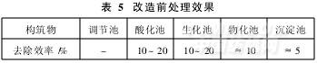 由于該印染廠規(guī)模不斷擴大,原先各處理構(gòu)筑物的廢水處理情況均不理想。該廠由于條件限制,常規(guī)檢測以CODCr為主,各構(gòu)筑物處理效率(表5)不能滿足接管要求。