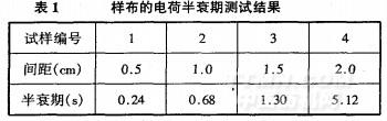 本文采用的是半衰期法。將試樣放在I4B型感應式靜電儀的旋轉(zhuǎn)金屬平臺上,用高壓對置于旋轉(zhuǎn)金屬平臺上的試樣放電30s,測感應電壓的半衰期(s)。測試結(jié)果如表1:
