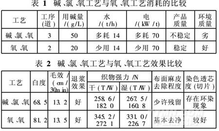 質(zhì)量較差的坯布,則有必要在氧漂前加一道酸洗,以減少重金屬屑(離子)的危害。以59/59tex169/189根/10cm粘/亞麻(25/75)織物前處理為例,兩種前處理工藝各項(xiàng)指標(biāo)比較如表1、2。