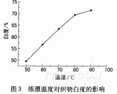溫度是影響漂白反應(yīng)的重要因素,較高溫度能加快漂白速率,而在H202/NOBS活化漂白體系中,溫度還會對NOBS產(chǎn)生一定影響。設(shè)定工藝條件:DM.13610.4g/L,DM一13701.5g/L,35%H2026g/L,NaOH2g/L,NOBS1g/L,漂白時(shí)間60arin,考察練漂溫度對織物白度的影響,結(jié)果見圖3。