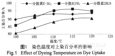 從圖1可以看出,隨著染色溫度的升高,分散染料對竹炭滌綸纖維束的上染百分率呈上升趨勢,其中,分散紅FB的上染百分率在115℃時(shí)最大,而分散藍(lán)2BLN、分散黃E-3G的上染百分率則在120℃時(shí)達(dá)到最大值。這是由于竹炭纖維的結(jié)構(gòu)不像PET纖維那樣致密,因而其玻璃化溫度較低。在玻璃化溫度以上,竹炭滌綸纖維發(fā)生劇烈運(yùn)動(dòng),分子間的空隙增大,自由容積增加,使染料容易擴(kuò)散進(jìn)入纖維內(nèi)部,并迅速、充分上染纖維??紤]到高溫條件下易使竹炭顆粒
