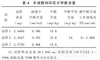 分別取3個羊絨數(shù)碼印花片試樣,測其甲醛含量,其結(jié)果滿足低于標準甲醛含量,結(jié)果參見表4.