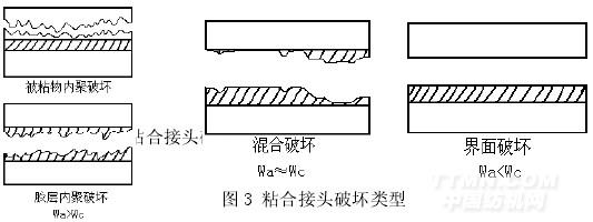 可以利用粘合功的計算值來預(yù)測粘合強度的大小。實際上,是根據(jù)測定粘合接頭試片的斷裂強度來判斷粘合強度。粘合接頭的破壞,依其破壞的位置,又可分為分為 3 種情況。具體粘合接頭破壞類型如下圖 3.