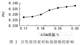 不同的引發(fā)劑用量還對(duì)增稠劑的粘度指數(shù)(PVI)有影響(見(jiàn)圖2)。