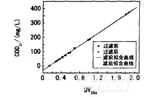 經(jīng)過計算機(jī)擬合的過濾后回歸方程的相關(guān)系數(shù)R為99.997%,剩余標(biāo)準(zhǔn)離差SE為0.818。與過濾前相比,過濾后的回歸方程具有更大的相關(guān)系數(shù)和更小的剩余標(biāo)準(zhǔn)離差,說明過濾后CODCr與UV254具有更好的相關(guān)性,且精密度更好。由圖2可知,對于同一試樣,過濾后的CODCr值降低了,這是因為過濾后顆粒狀的有機(jī)物被懸浮顆粒吸附而被去除,試樣中有機(jī)物的含量減少,此時所測值反映的是溶解性有機(jī)物的CODCr值。